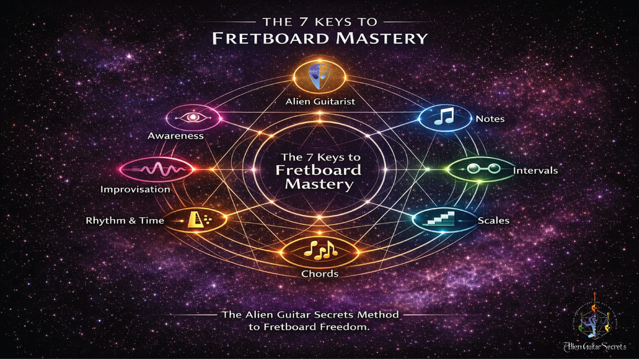 Most guitar lessons teach shapes and patterns without explaining how the fretboard truly connects. At Alien Guitar Secrets you learn how notes, intervals, scales and chords form one connected musical system so the guitar becomes intuitive.